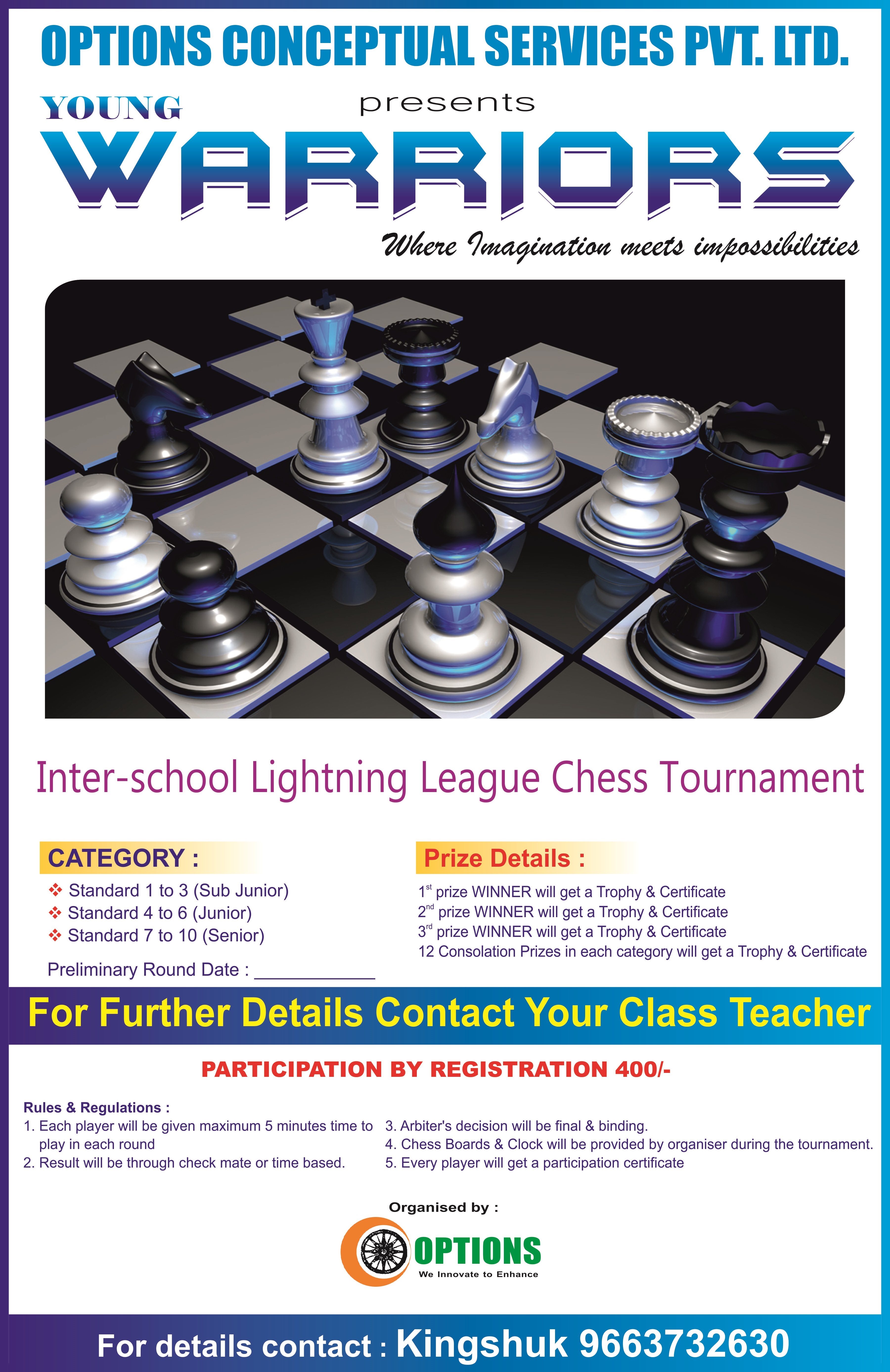 Options Conceptual Services Pvt Ltd has successfully accomplished the 14th Anniversary of ‘YOUNG WARRIORS’, an elite inter-school lightning chess tournament for children in Bangalore. The lightning chess is the fastest played chess format in tournaments. The objective is to enhance quick decision making skills in the budding ‘YOUNG WARRIORS’.